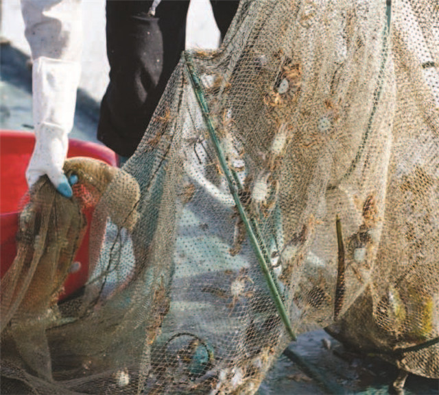 “阿渔妹”收起网笼捕获的小螃蟹,随后将小螃蟹重新放回大海里。