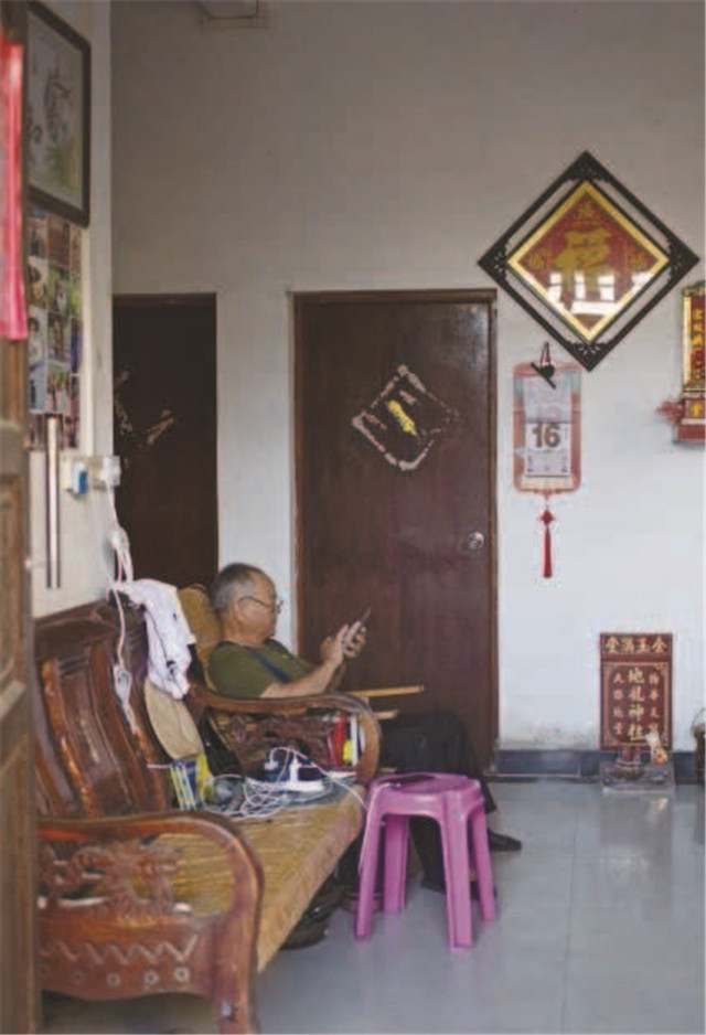 郑露婷的父亲在陇石村家中刷短视频。他一开始不支持女儿回乡创业做视频,如今成了“头号粉丝”,常给他人推荐关注“阿渔妹”。