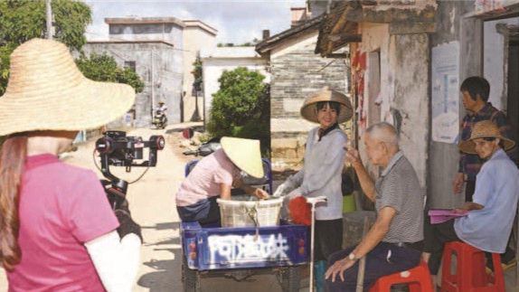 郑露婷将捕捞的杂鱼在陇石村售卖,团队伙伴在一旁录制视频。村民从一开始抗拒反感镜头,如今会配合拍摄。