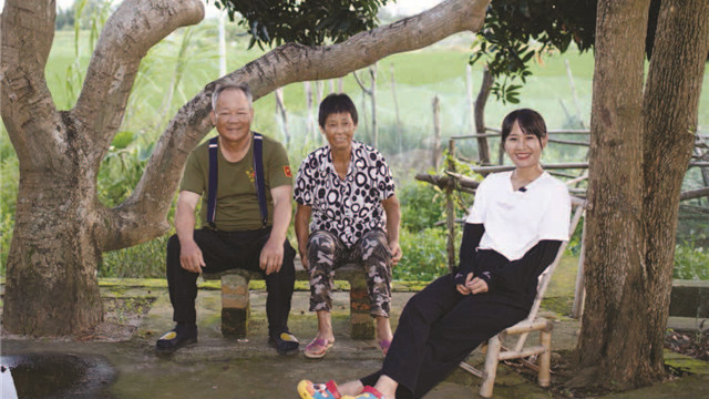 郑露婷和父母在陇石村家附近的树下合影。