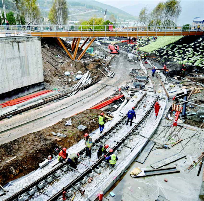 太子城冰雪小镇建设的一大亮点是将在预留空间内架设一条长1.6公里的有轨电车线路,沿途设6个站点,届时运动员、志愿者和观众可以通过有轨电车实现高效、绿色、便捷的换乘。图为建设工人正在太子城冰雪小镇有轨电车线路处施工。
