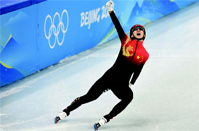 2 月7 日晚, 北京2022 年冬奥会短道速滑项目男子1000 米决赛在首都体育馆举行。图为中国选手任子威夺冠后庆祝。