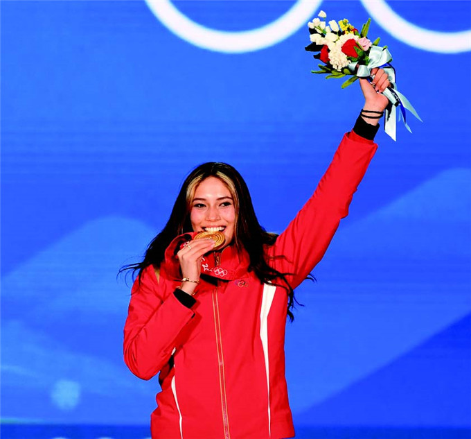 2 月8 日,在北京首钢滑雪大跳台举行的北京2022 年冬奥会自由式滑雪女子大跳台决赛中,中国选手谷爱凌夺得冠军。
