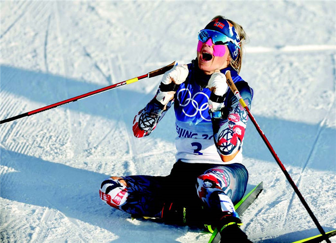 2 月5 日,挪威选手约海于格庆祝夺冠。该项目产生本届冬奥会首枚金牌。