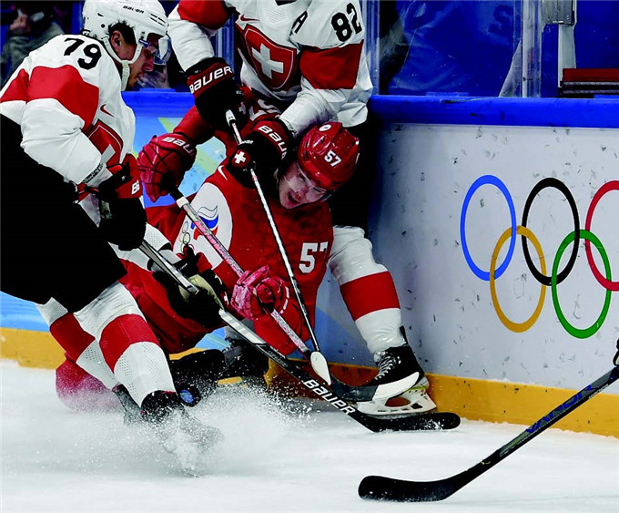 2 月9日, 双方球员在比赛中拼抢。当日,在国家体育馆举行的北京2022 年冬奥会男子冰球小组赛中,俄罗斯奥委会队以1 比0战胜瑞士队。