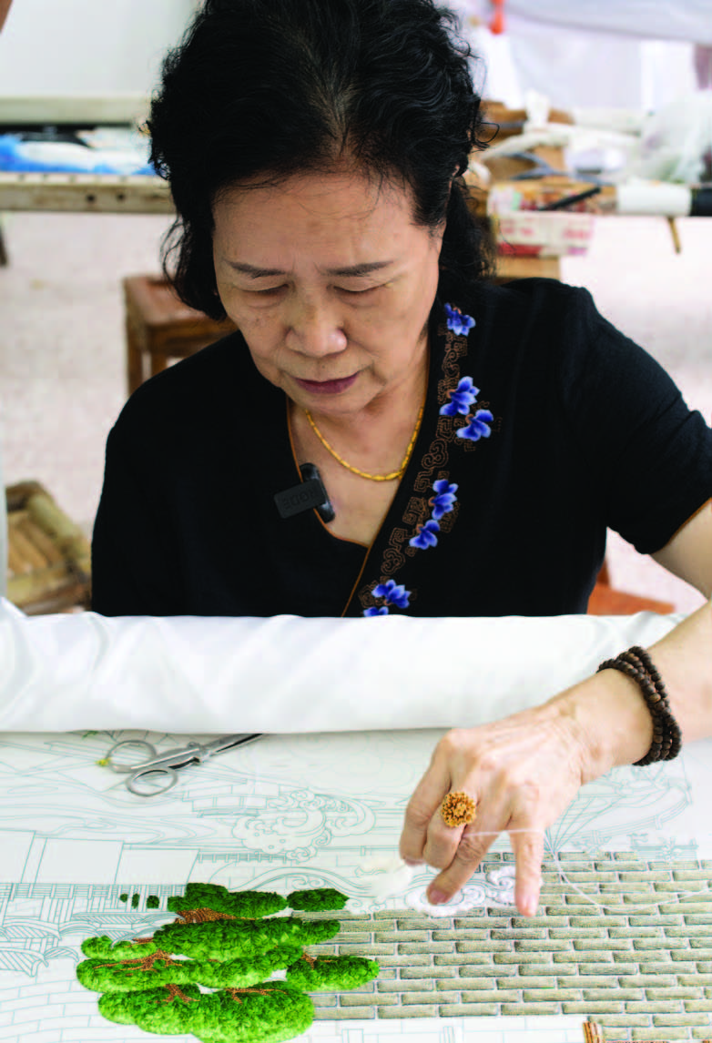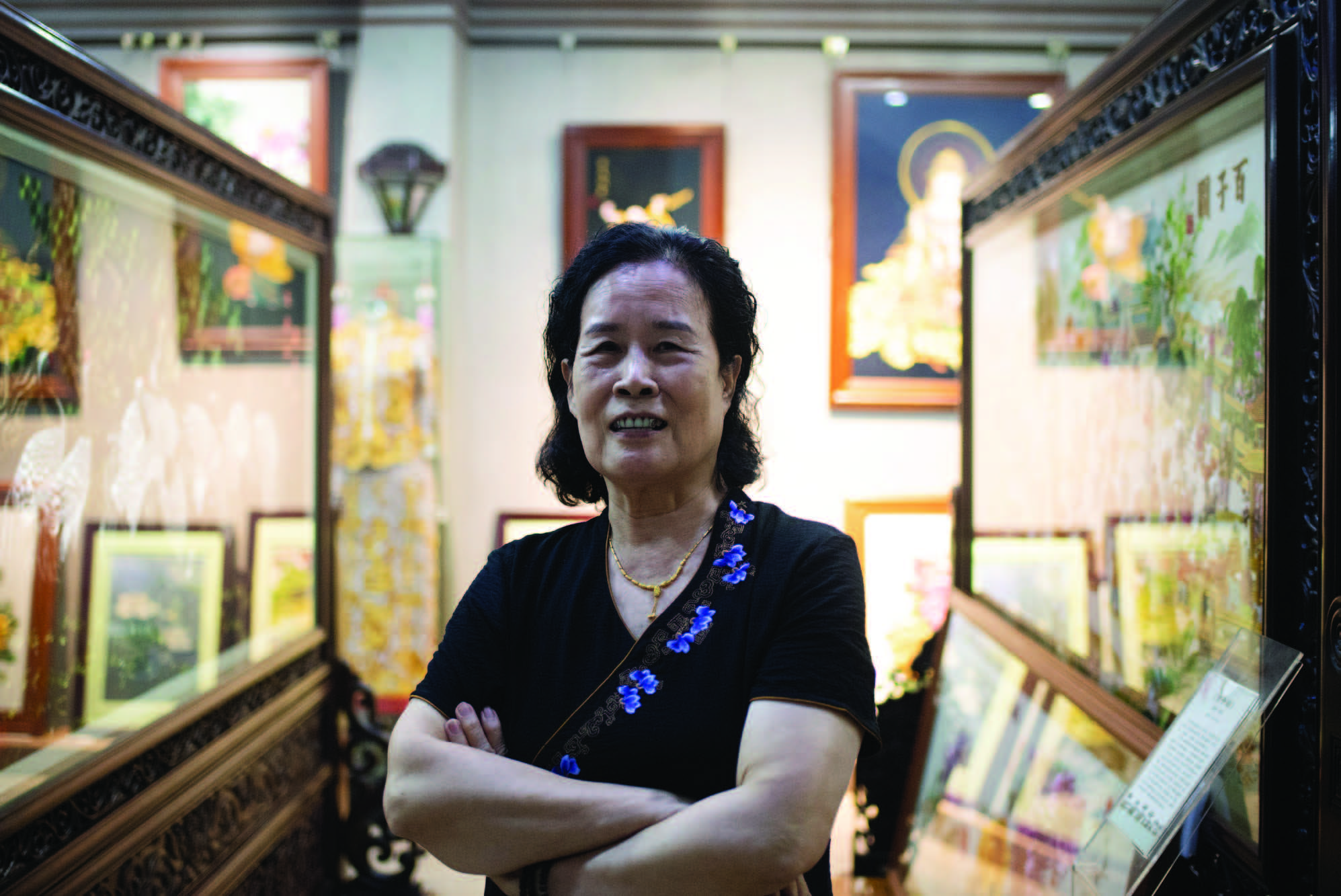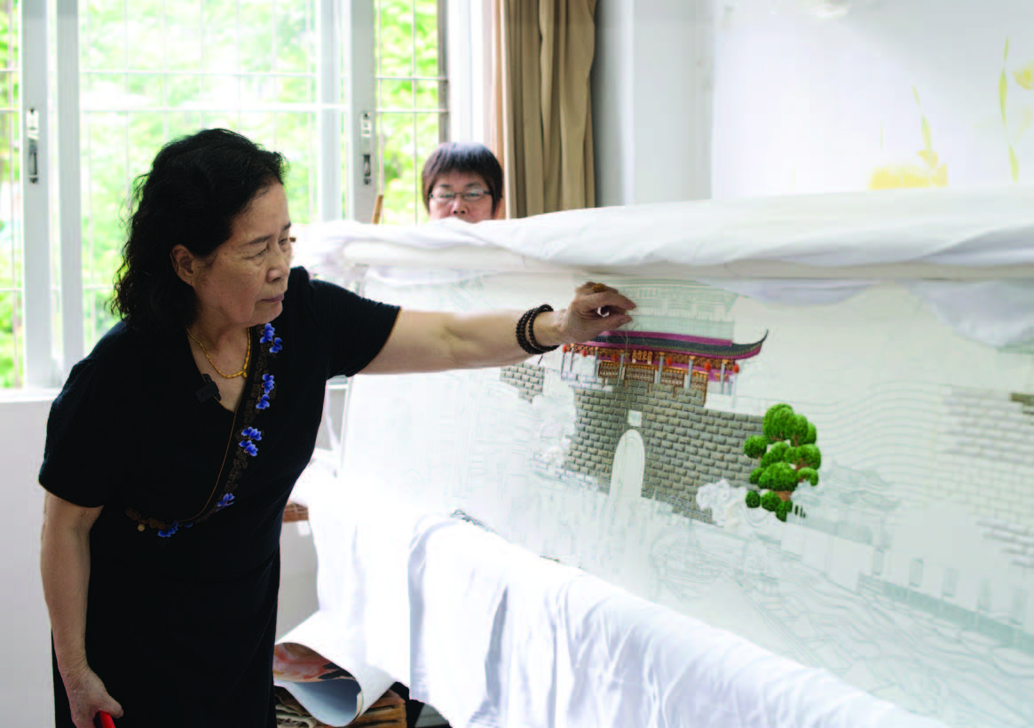 康惠芳在她的潮绣工作室查看创作中的作品“ 一桥一楼一街”。