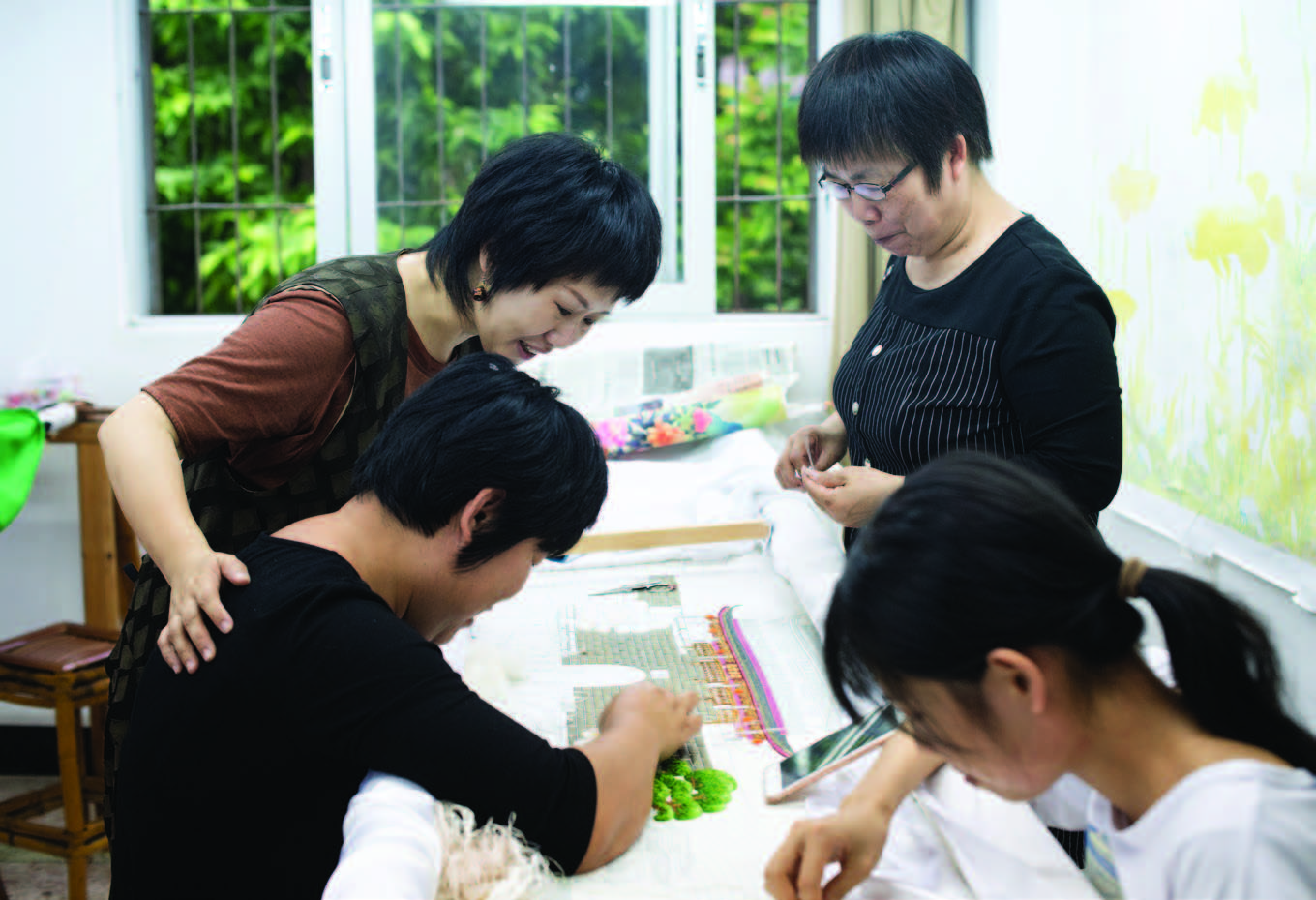 图为潮州市鸿辉礼服厂的设计总监佘丹晖(左一)在她母亲康惠芳的工作室和绣娘讨论潮绣。