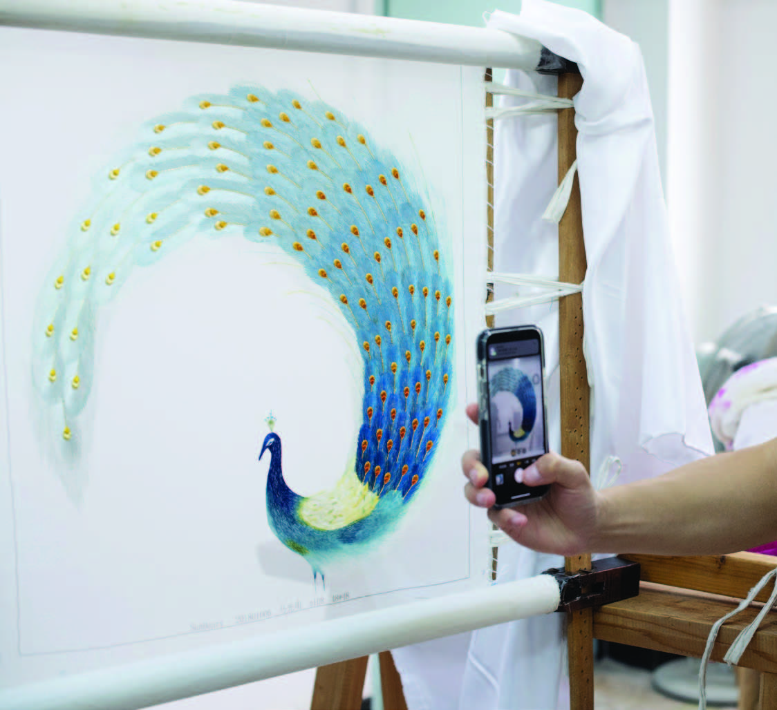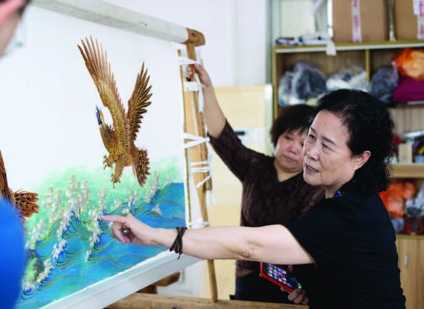 记者在潮绣大师康惠芳的工作室拍摄一副将要完成的潮绣孔雀。