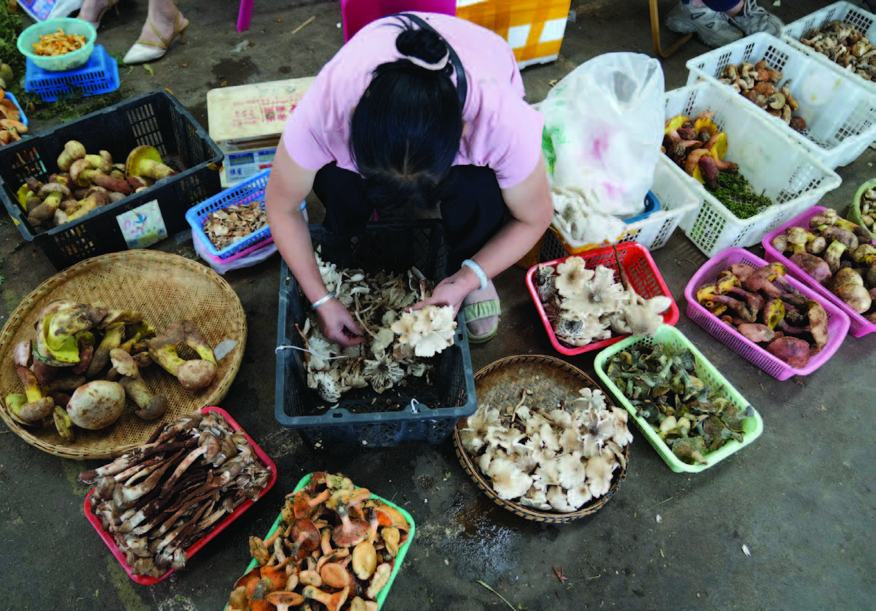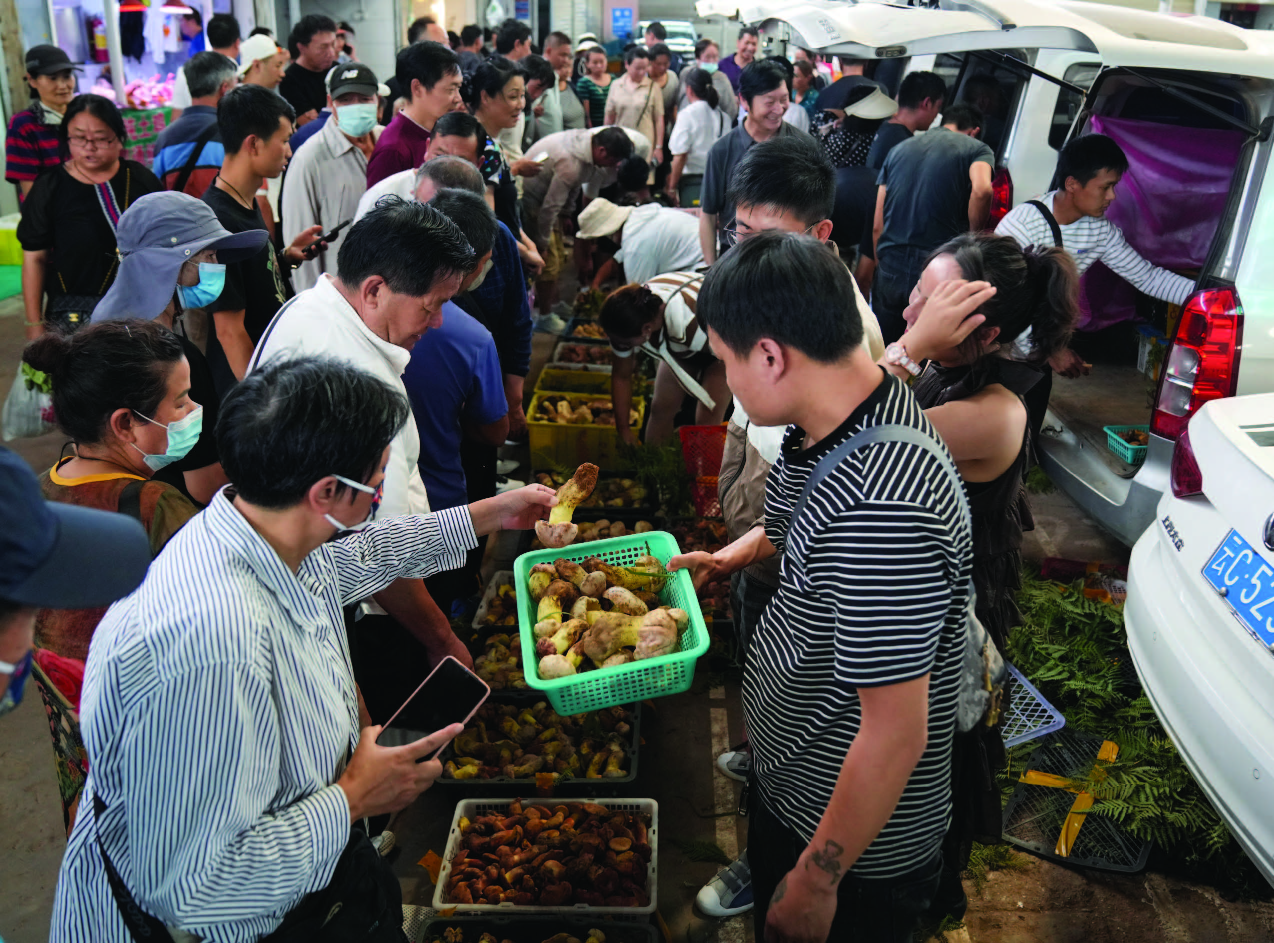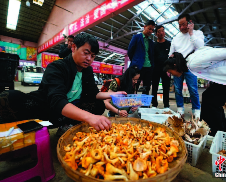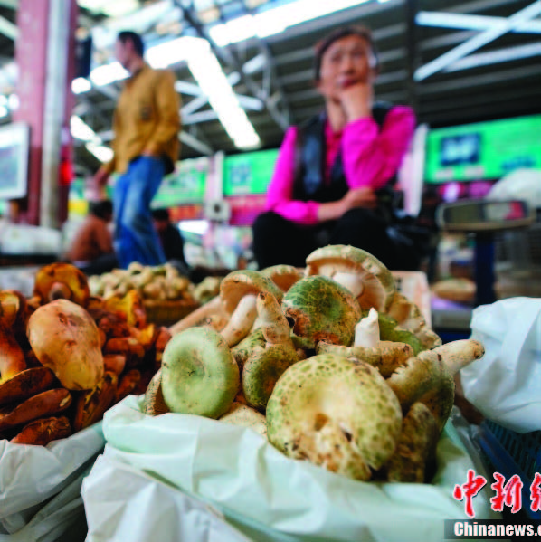云南昆明的野生菌交易市场里,市民挑选刚到货的野生菌。