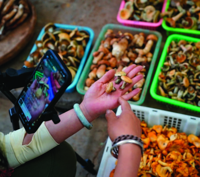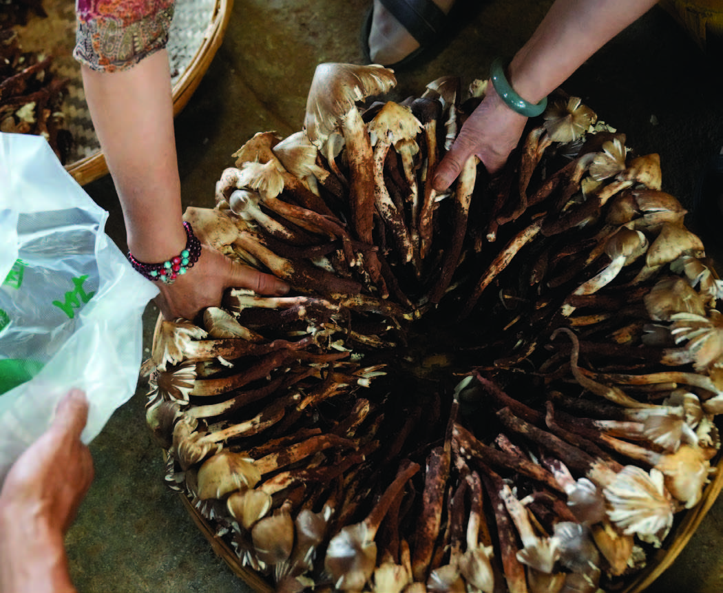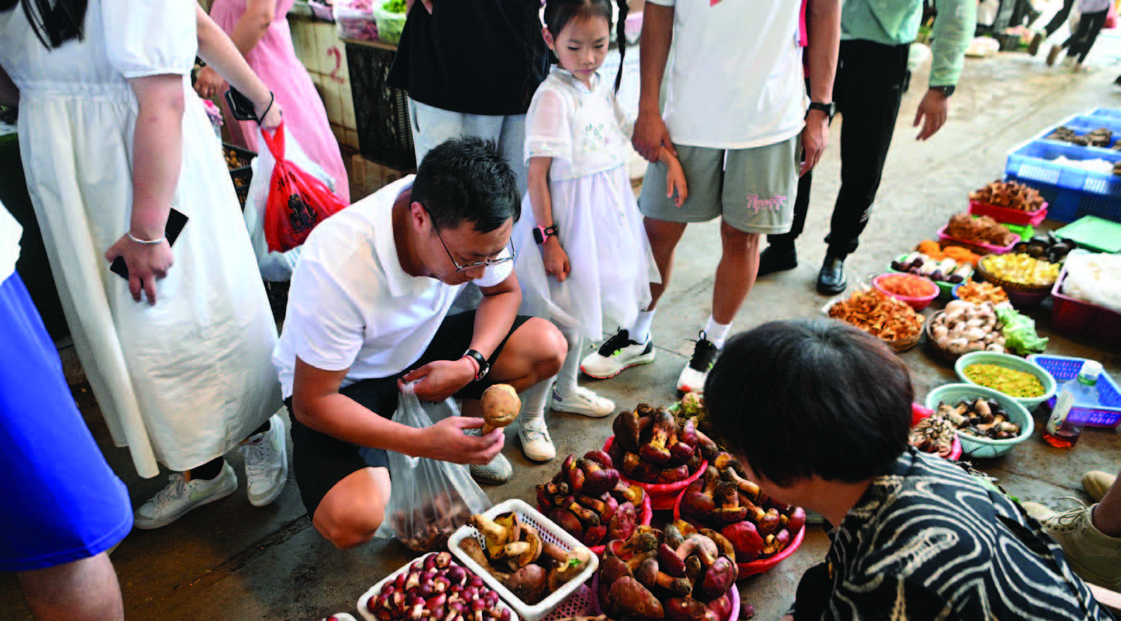 云南木水花野生菌交易中心内,摊主正在给顾客挑选野生菌。