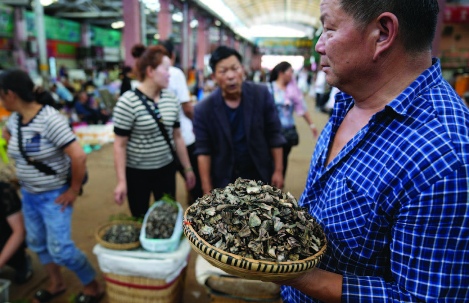 云南昆明的野生菌交易市场内售卖干巴菌的商贩。