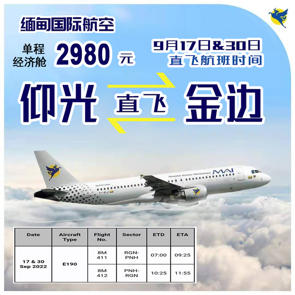 好消息!MAI缅航9月份继续执飞仰光-金边-仰光航班