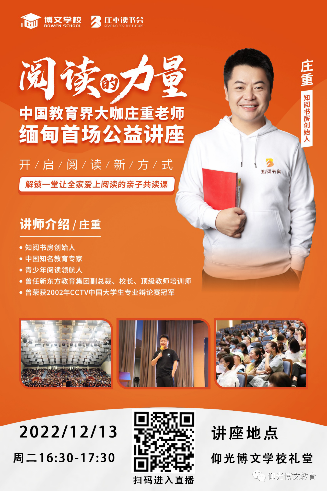 主办单位:博文学校&知阅书房 诚邀各位朋友参加~(线上可直接扫码进入直播,线下可来到博文学校礼堂) |