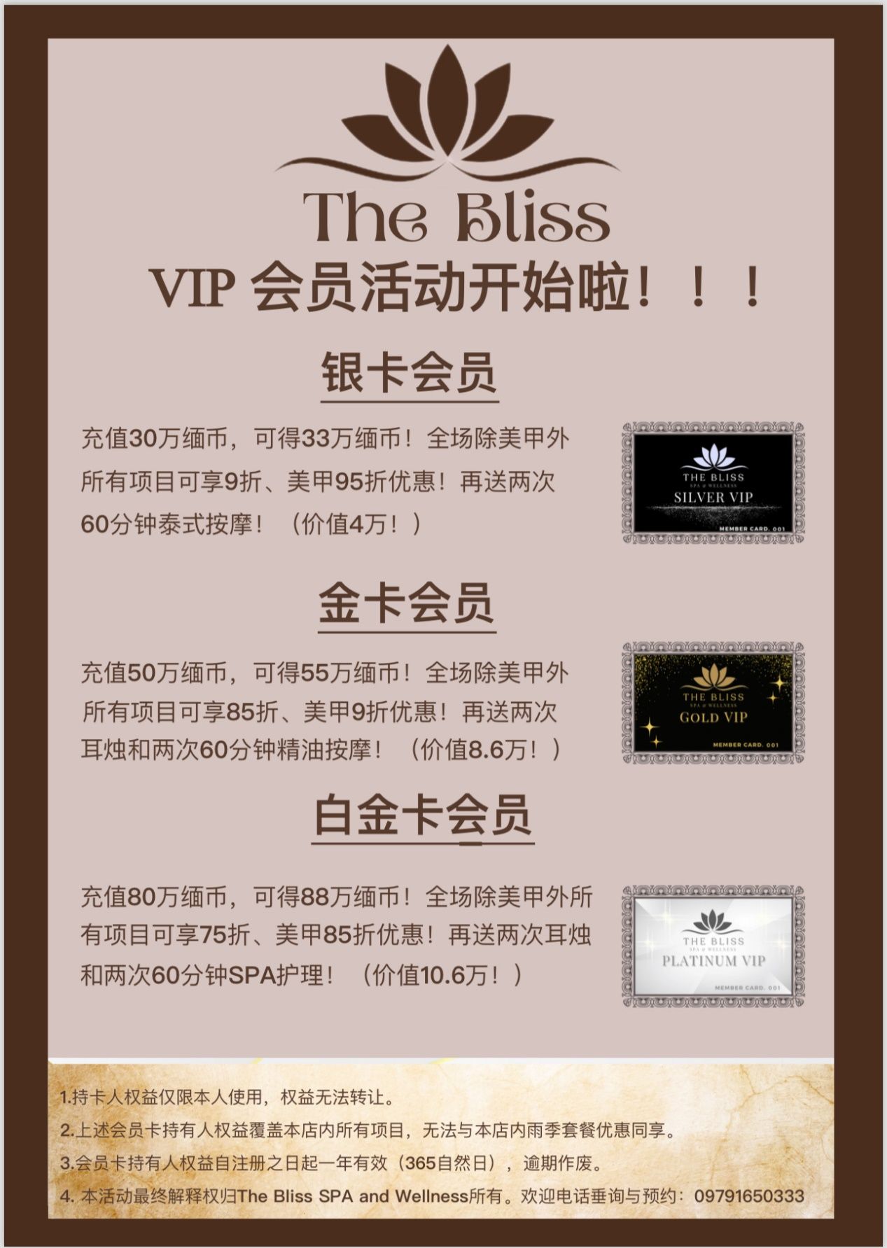 银卡会员:一次性充值30万缅币,即送3万,到账33万。可享全店所有项目(套餐除外)按摩9折优惠,美甲95折优惠!送两次60分钟泰式按摩!(价值4万)