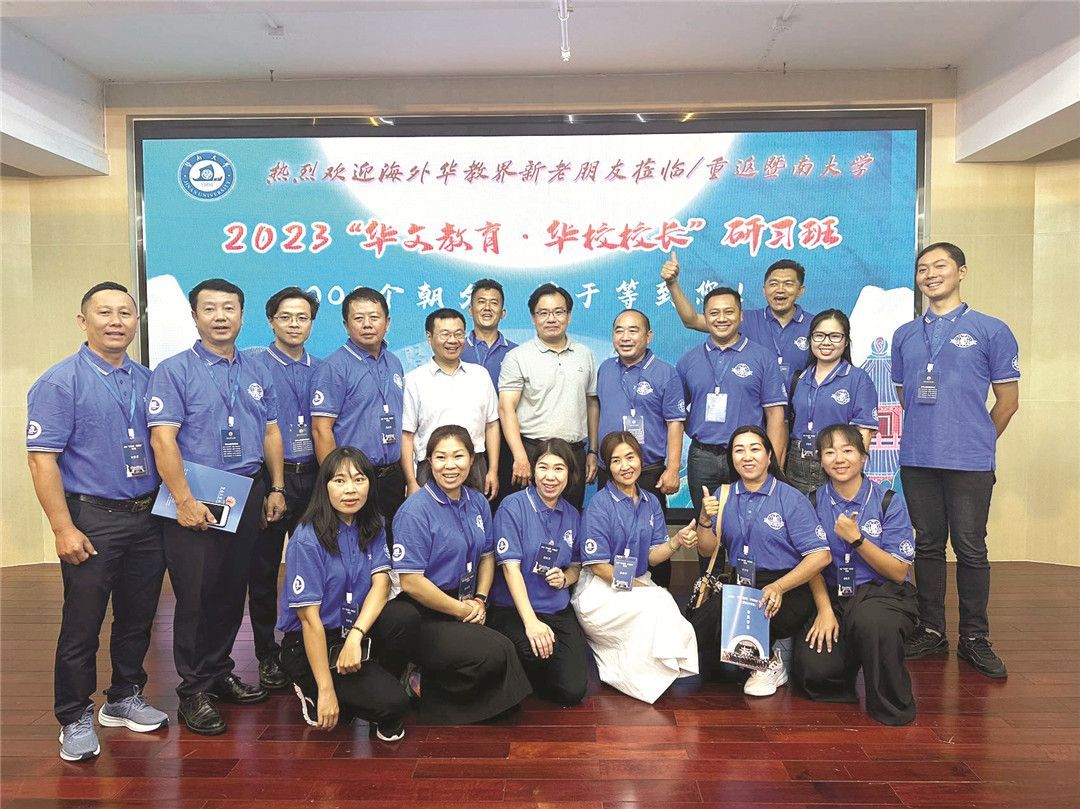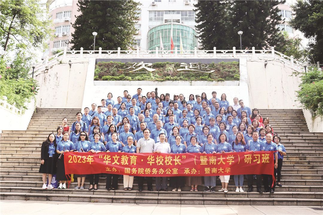 【本报讯】8月10日至19日,由中国国务院侨务办公室主办,暨南大学华文学院承办之2023“华校教育•华校校长研习班”在暨南大学华文学院举行。开班典礼上,暨南大学华文学院党委书记谢煊、副院长张礼、招生与社会合作部主任方李瑾、副主任颜婷婷、教师代表李卫涛及来自世界25个国家101位校长共同出席。