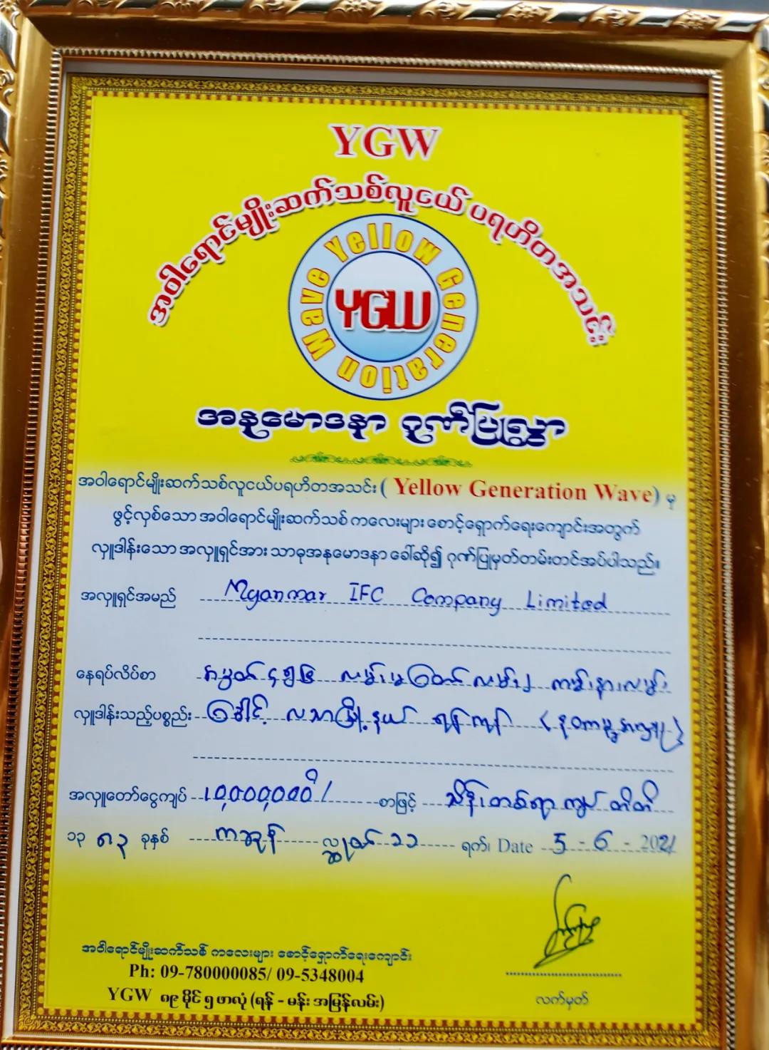 在YGW慈善学校捐赠仪式上,缅甸IFC向YGW慈善学校捐款1000万元缅币,款项将用于改善儿童生活条件,促进儿童健康学习成长。