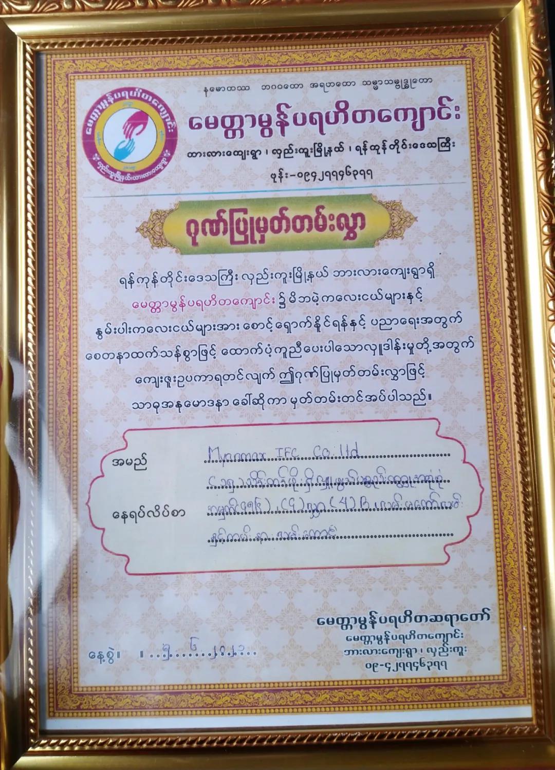 在MitTarMon慈善学校捐赠仪式上,缅甸IFC向MitTarMon慈善学校捐赠150万元缅币物资。缅甸IFC表示希望孩子们可以有所依靠、有所希冀,从而更加融入社会,也能接受到更好的教育,拥有更美好的未来。