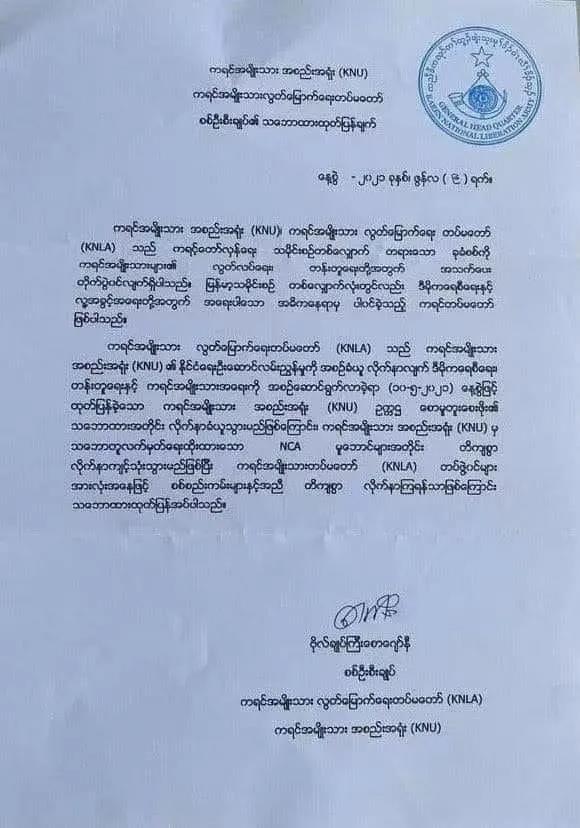 【缅甸金凤凰报讯】克伦民族联盟(KNU)、克伦民族解放军(KNLA)总司令索皎尼上将(စောဂျော်နီ)于6月9日发表声明称,将遵守KNU签署的全国范围停火协议(NCA)的框架规定。呼吁所有KNLA队员严格遵守相关军规。