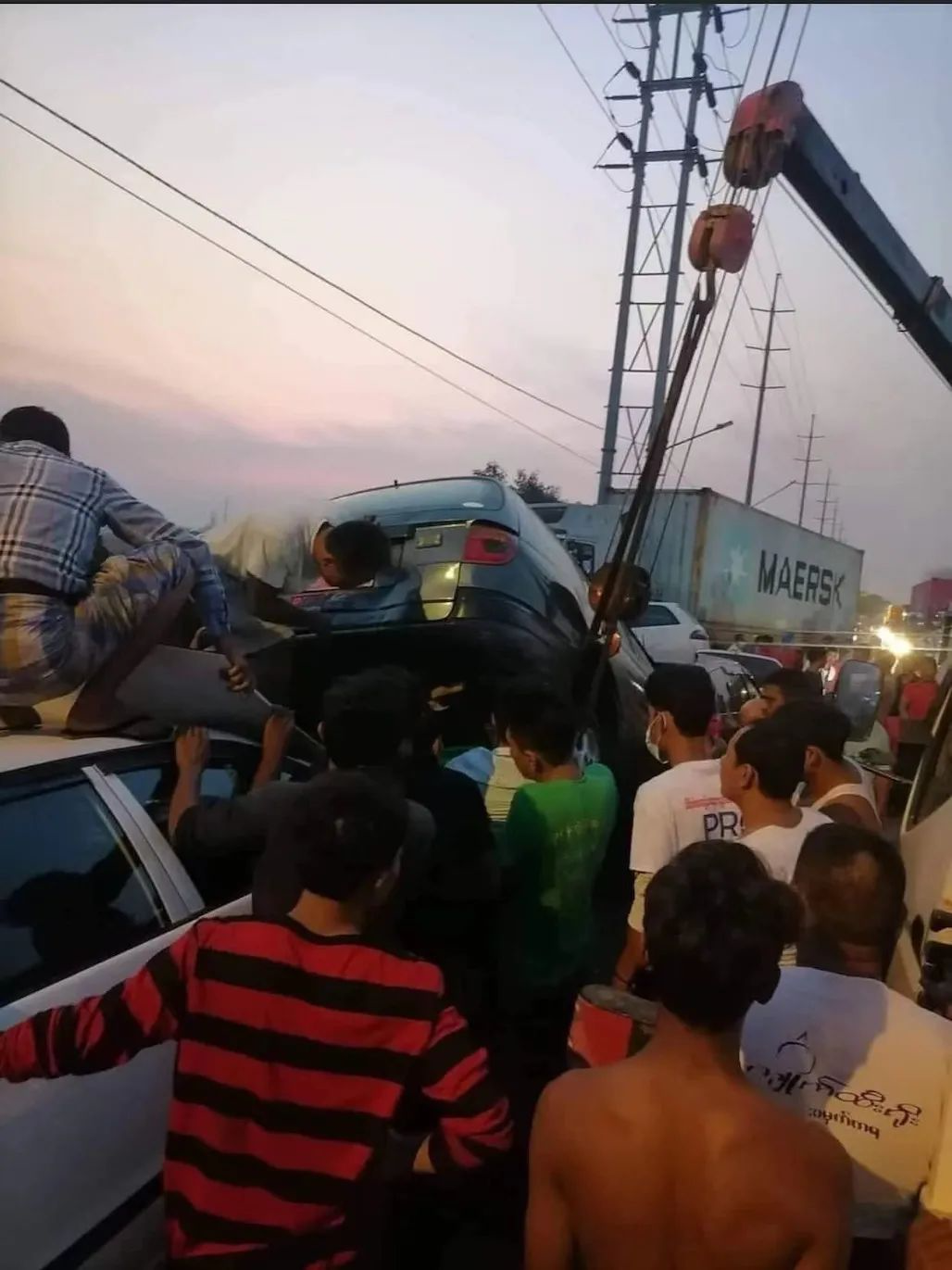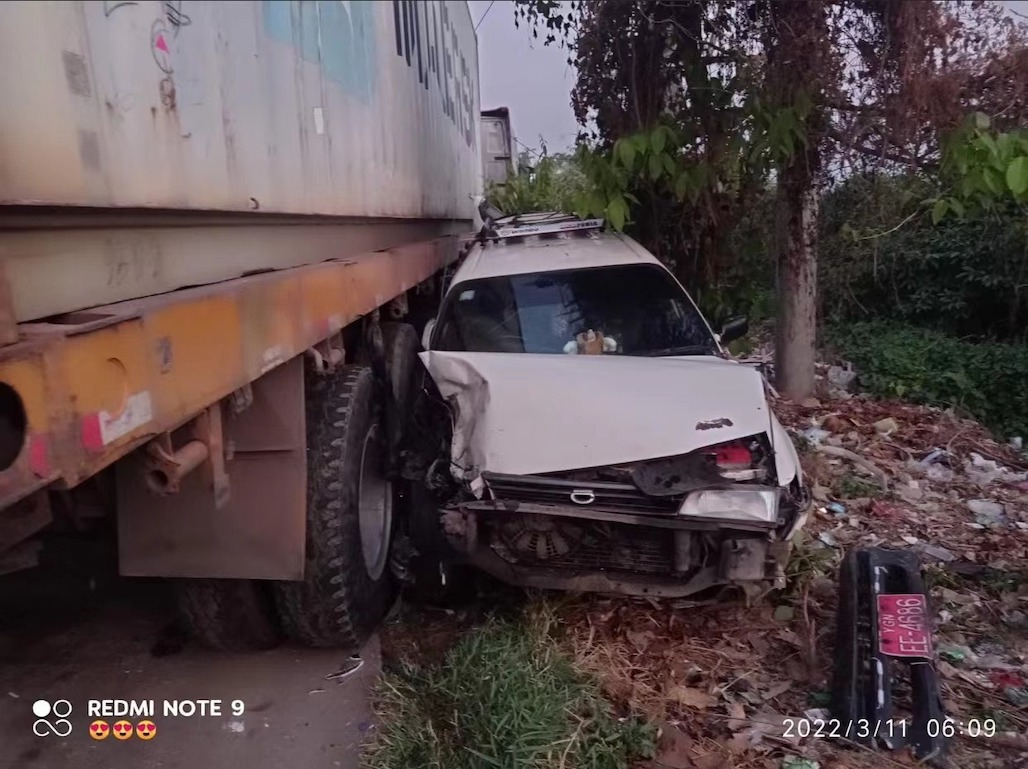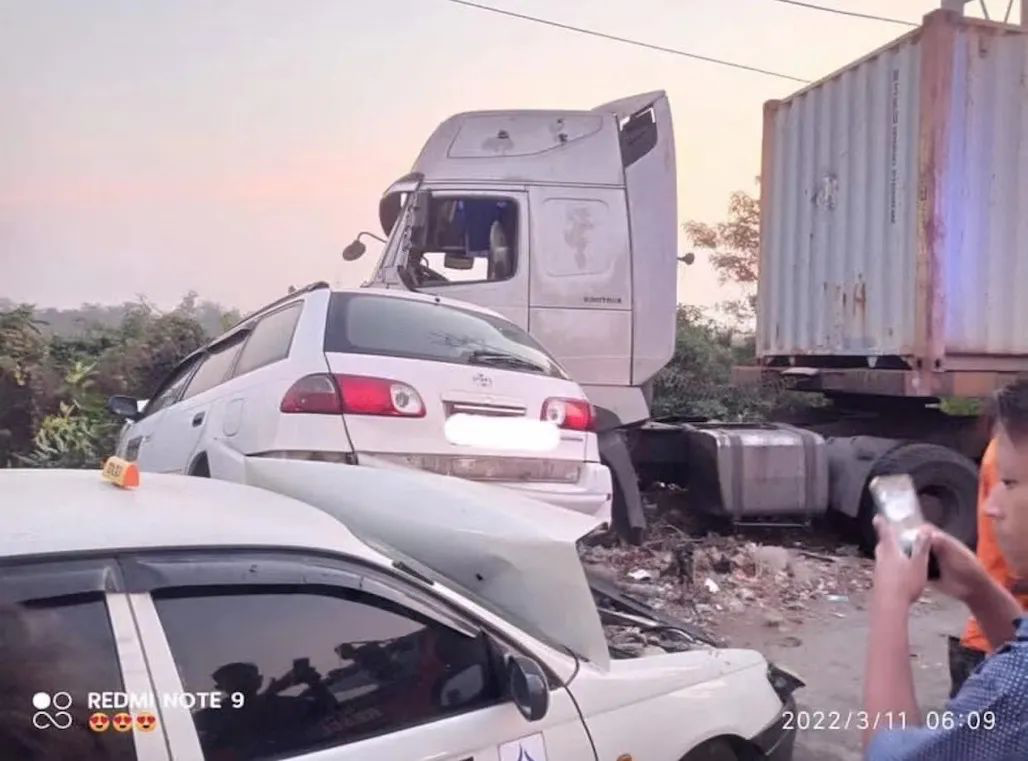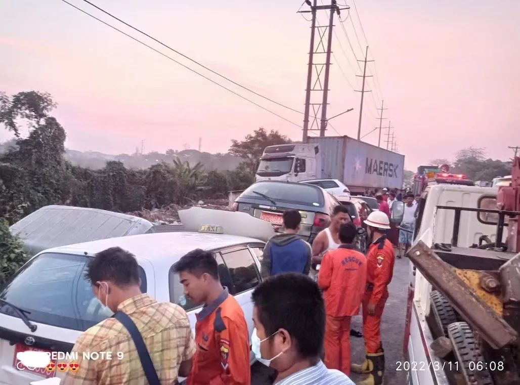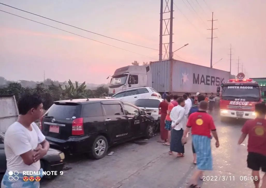 【缅甸金凤凰讯】据社会救援组织消息,3月11日早上6点左右,在仰光,南达贡镇区的Maungmakan路上,一辆集装箱卡车撞上等待加液化天然气的车队,造成一人死亡,四人受伤。