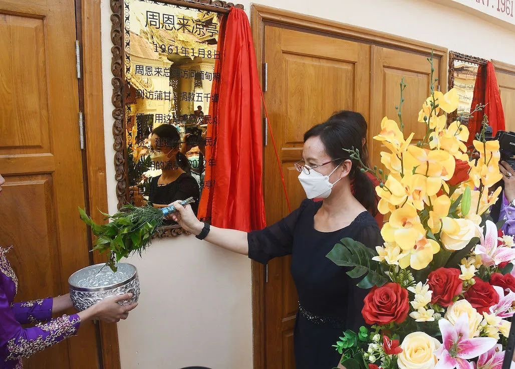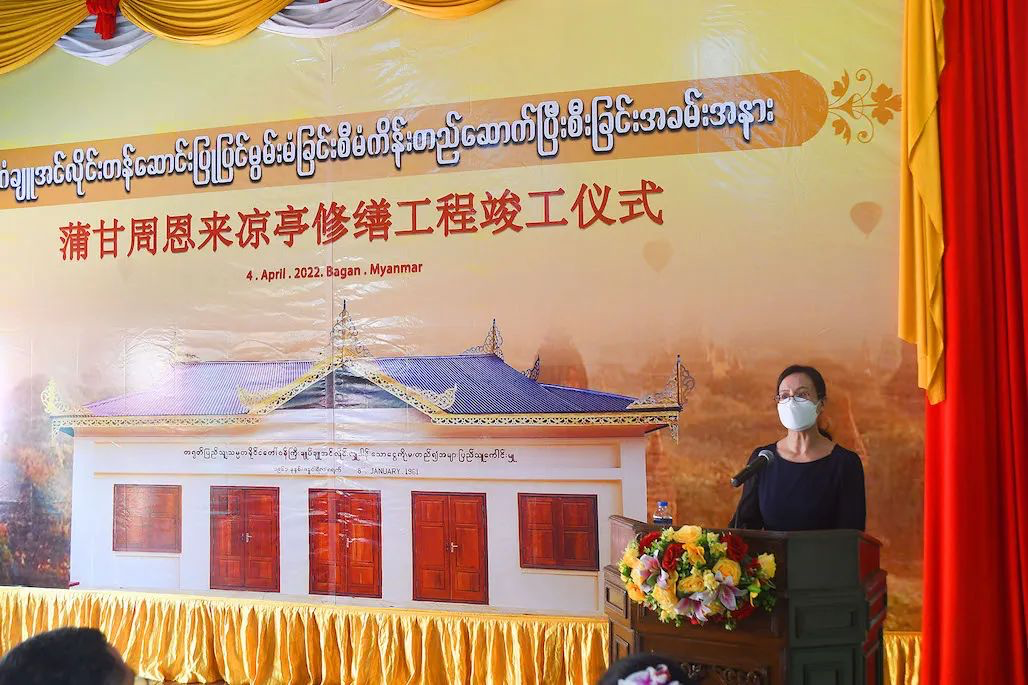 “明天是中国追思逝者的传统节日清明节。睹物思人,看到这座凉亭,周总理的音容笑貌和关心推动中缅胞波友好的一幕幕历史画面不禁浮现眼前。我们今天举行凉亭竣工仪式是对周总理最好的纪念。”李小艳公参说,“周恩来凉亭是中缅友好的载体,保护好、管理好这座凉亭,既是中缅双方的共同心愿,也是共同的责任和使命。相信在中缅双方共同努力下,修葺一新的凉亭将为服务当地民众,传承胞波情谊发挥更大作用。我们也将继承周总理等老一辈领导人的遗志,发扬中缅友好精神,推进同缅人文等各领域交流合作,更好造福两国人民。”