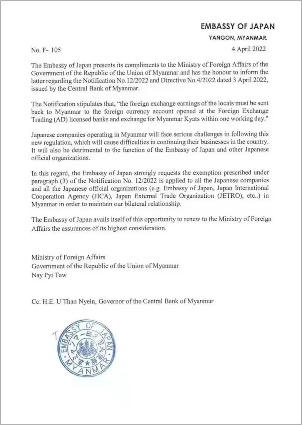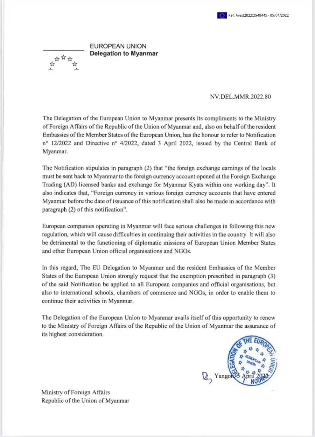 “强制结汇令”颁布后,日本、新加坡、欧盟等多个国家和国际组织的驻缅机构纷纷作出反应,要求缅甸当局给予“豁免权”,否则将影响双边经贸关系。