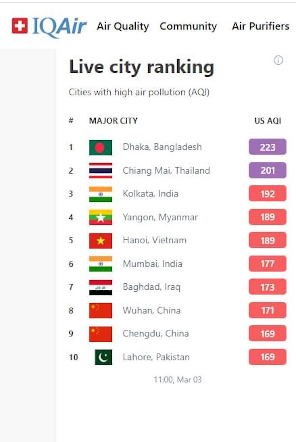 据悉,IQ Air的全球空气质量指数每天都会发布。2月28日,缅甸仰光的空气污染排名第2;3月3日排名第4,空气质量指数为189;3月6日排名第12,空气质量指数为153。