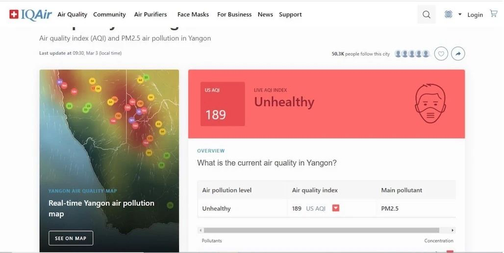 本月初,仰光被瑞士空气质量技术公司IQ Air依据空气质量指数(Air Quality Index AQI)排名,列入全球10大污染最严重城市的之一。