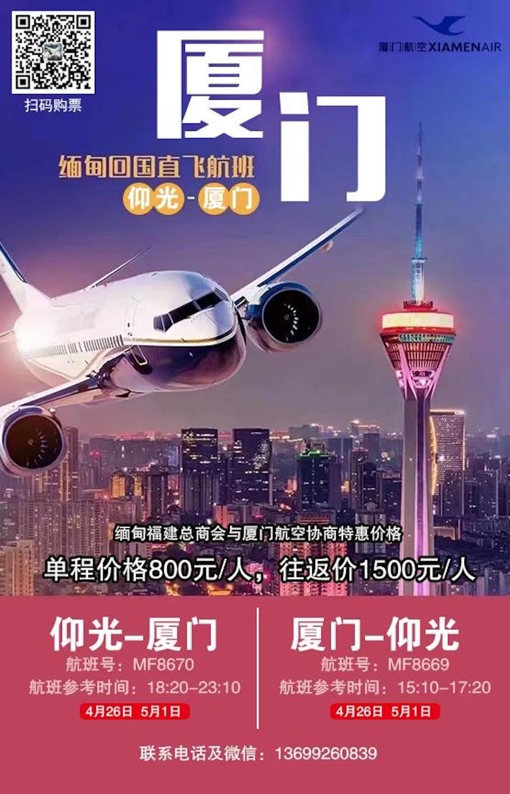 厦门航空的厦门-仰光往返国际航线也将于4月26日复航。