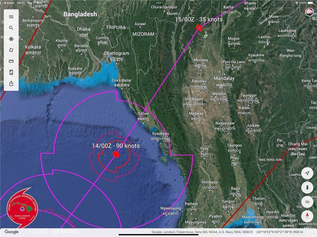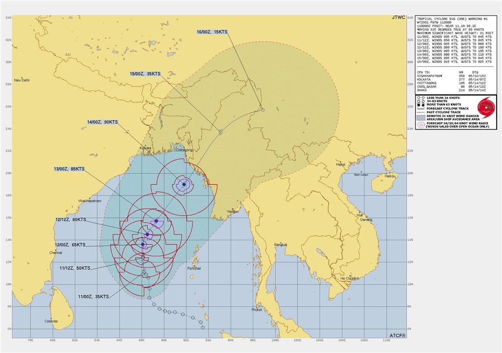 今天,气旋中心已经位于缅甸科科群岛(Coco Islands)西南偏西约365海里、海基岛(Hainggyigyun)西南偏西约475海里、实兑镇区(Sittwe Township)西南偏南约615海里、印度尼科巴群岛(Nicobar Islands)西北偏西约415海里、布莱尔港(Port Blair)西南偏西约280海里以及孟加拉国科克斯巴扎尔(Cox's Bazar)西南偏南约665海里处的海域。