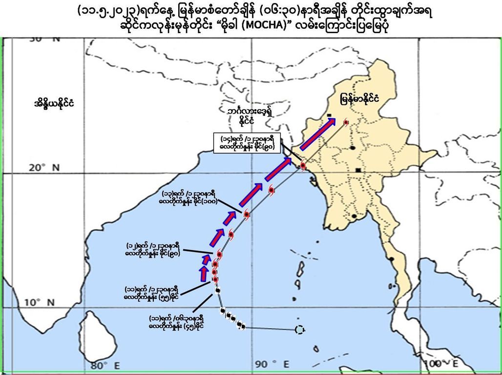 【缅甸金凤凰讯】据缅甸水文气象局今早(5月11日)发布的天气预报,超强热带气旋“抹茶(Mocha)”正在逼近缅甸。当前,气旋风暴还未正式登陆。但是,全国多地已经开始出现大风,并伴随降雨天气。