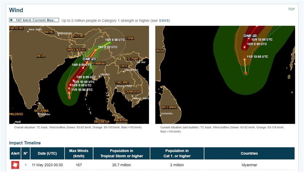 根据全球灾害警报和协调系统(Global Disaster Alert and Coordination SYSTEM)信息,气旋Mocha进入缅甸实兑是肯定的。目前已对气旋风暴Mocha发出“红色警报”警告,若开邦、马圭和实皆省将约有200万人面临遭受强风袭击的风险。