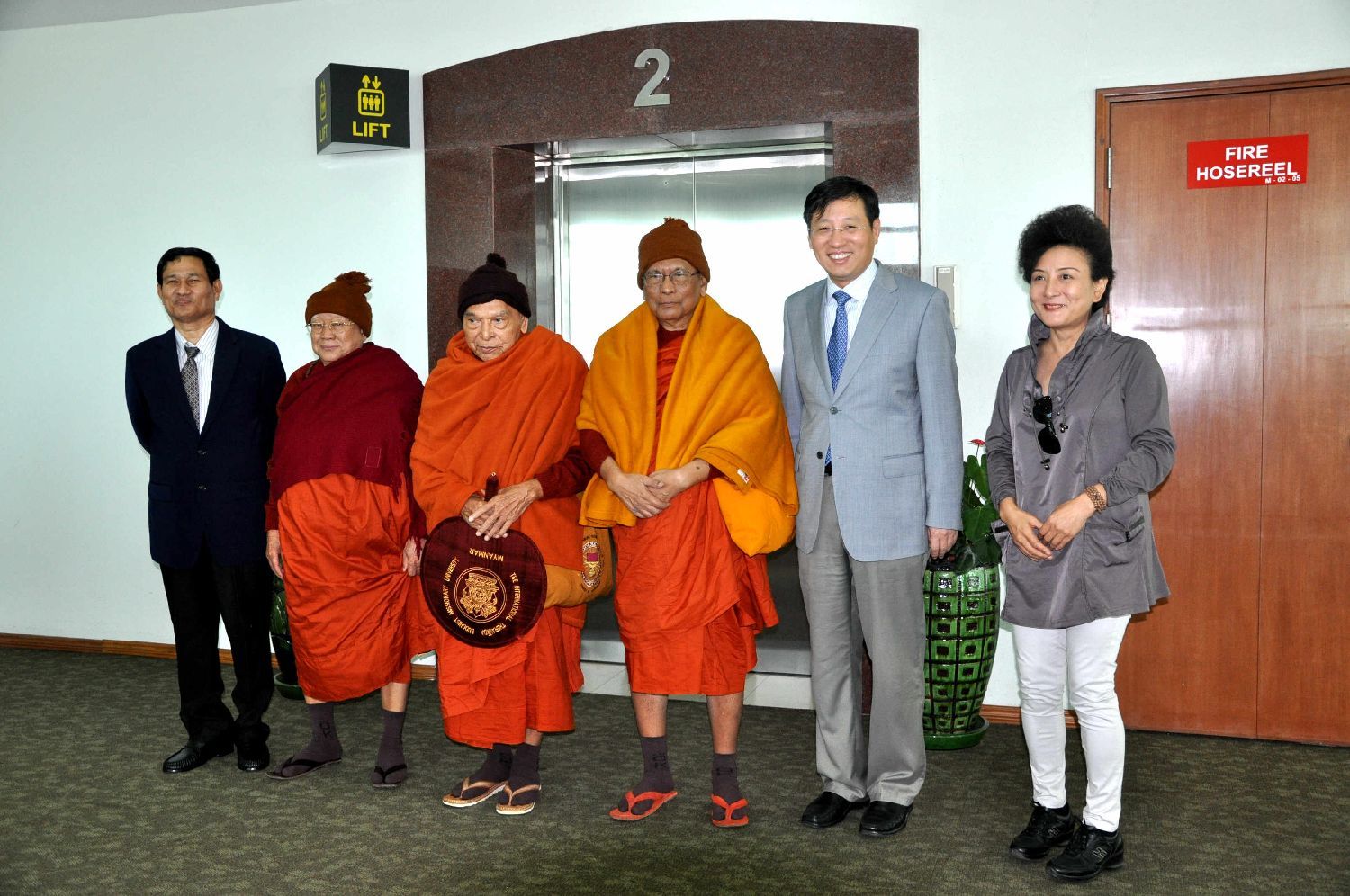 2015年12月21日,时任中国驻缅甸大使洪亮为缅甸僧侣协会主席八莫大师访华送行。