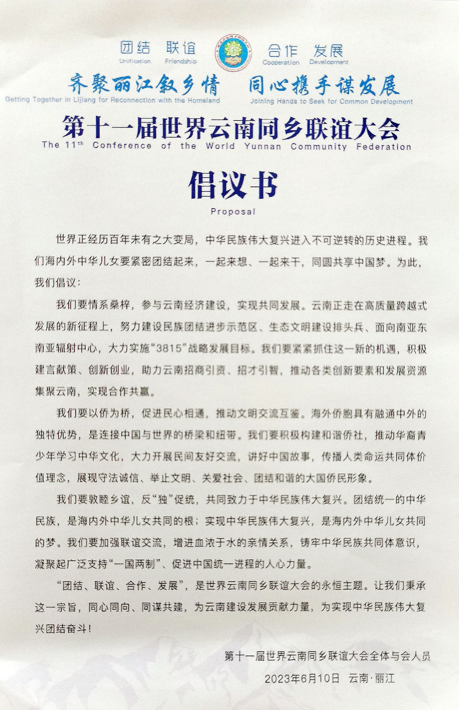 开幕式上,缅甸仰光云南会馆张迎春会长作为与会云南同乡代表宣读了《第十一届世界云南同乡联谊大会倡议书》,号召海内外中华儿女紧密团结起来,一起来想、一起来干,同圆共享中国梦。
