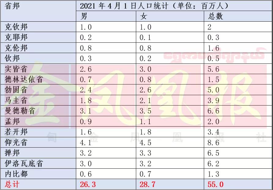 根据最新的统计报告,缅甸人口总数比2020年的5458万增长了42万人。其中仰光省、曼德勒、掸邦的人口位列前三,分别为860万人、660万人和650万人。