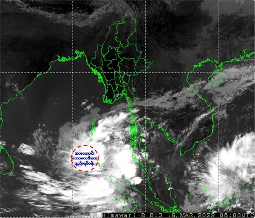 飓风于3月21日袭击伊洛瓦底省海义岛(ဟိုင်းကြီးကျွန်း)附近,预计3月22日会抵达若开邦沿海岸地区。