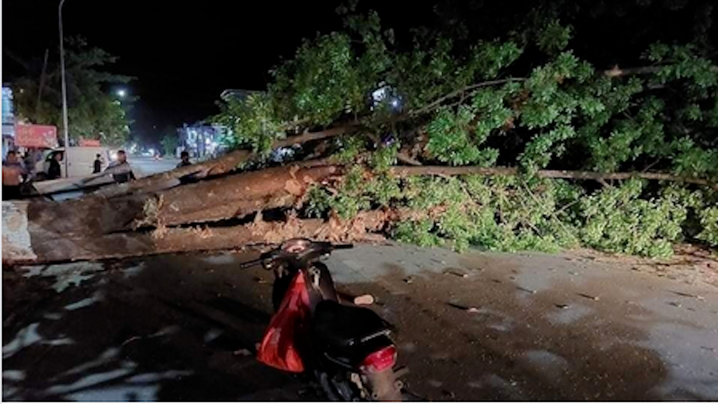 克伦邦巴安市(ဘားအံမြို့)20日因飓风袭击一路边大树倒塌。