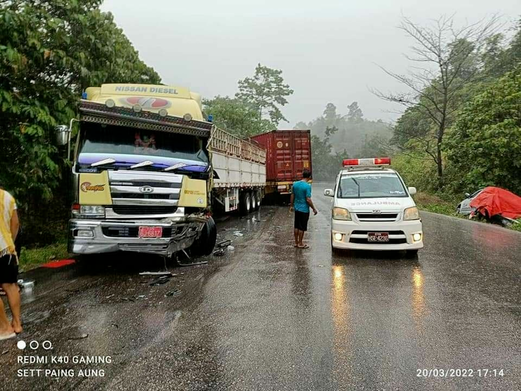 妙瓦底-高加力亚洲公路的贡格乐大桥转弯处(ကွင်းကလေးတံတားအပေါ်ကွေ့)20日下午5点左右,两辆货车相撞。当地救援组织称,下雨地滑可能是货车没有控制好速度。