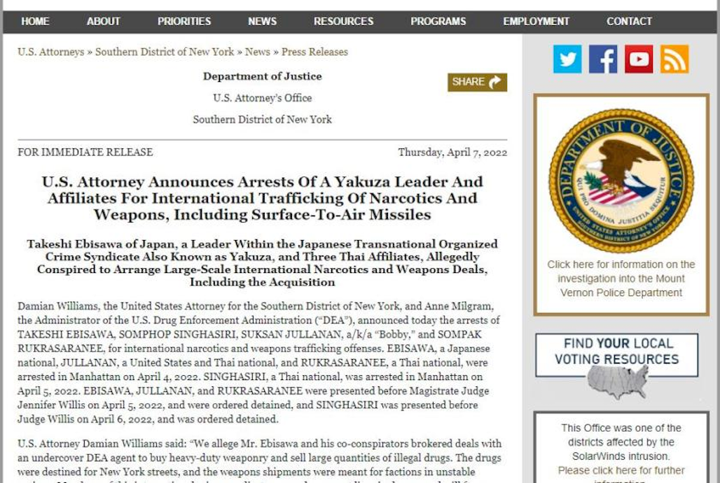 黑帮团伙头目Takeshi Ebisawa(海老泽武史)、Sompak Rukrasaranee、Somphob Singhasiri和Suksan Jullanan四人于4月4日和4月5日分别在纽约被美国司法部逮捕,罪名是洗钱、走私武器、运输毒品等。