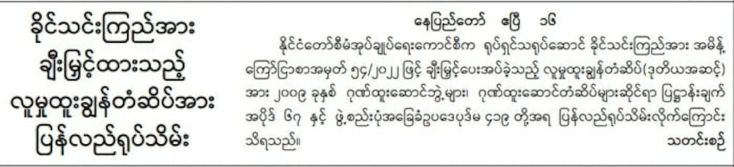 4月17日,国家管理委员在官方报纸上宣布,撤销此前依据第54/2022号令向女电影演员Khine Thin Kyi颁发的“社会领域优秀奖章(二等)”。