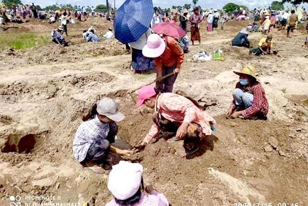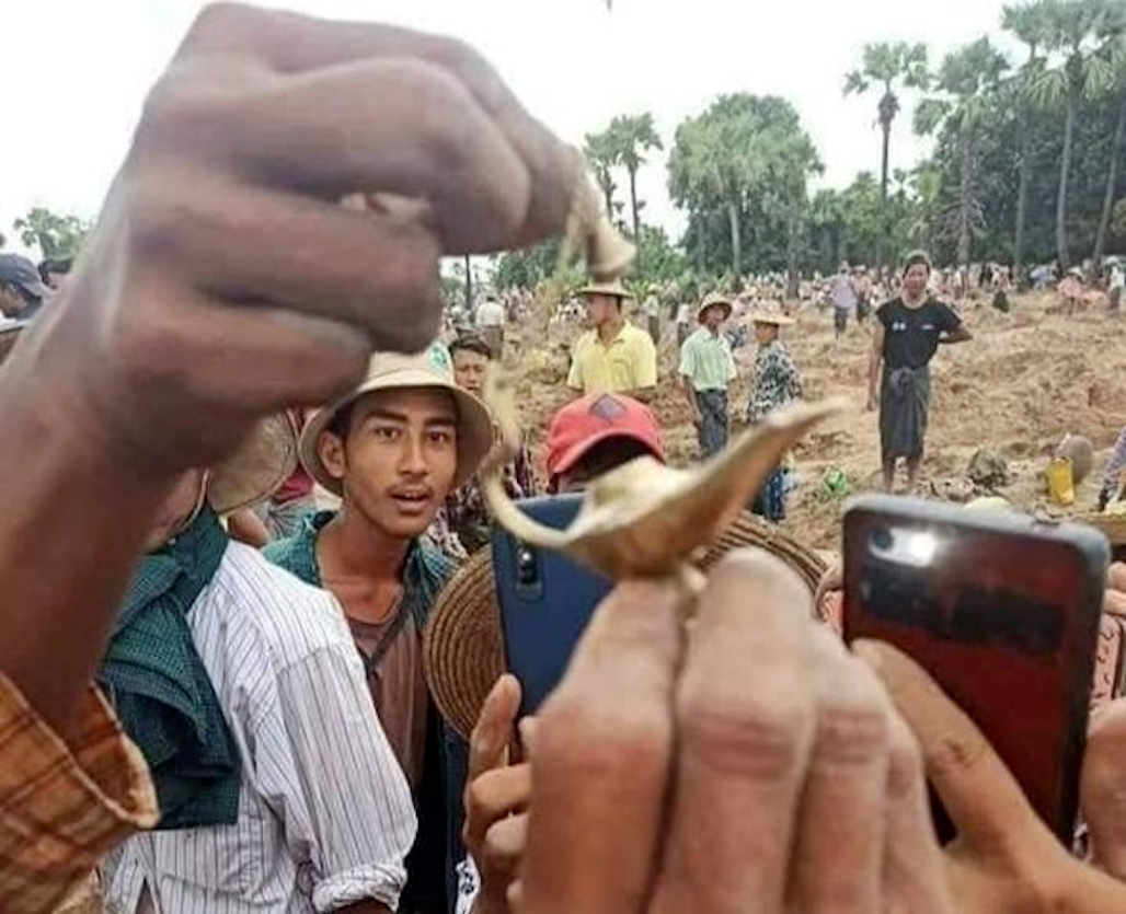 从当地人了解到,从5月份至今,在罕林“骠”古城附近的妙唐义村(မြောက်ထန်းကြီးကျေးရွာ)周边土地上发现古器后,每天都有数万人前来挖掘古器。