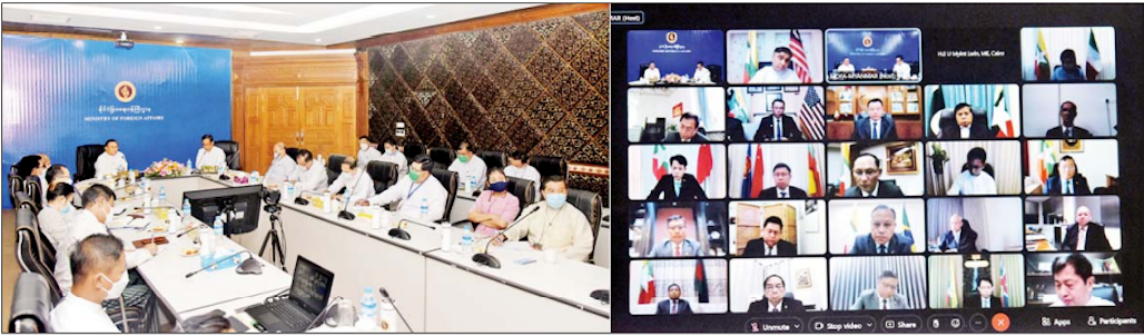 【缅甸金凤凰讯】9月6日,缅甸外交部部长吴温纳貌伦和国际合作部部长吴哥哥莱以视频方式与缅甸驻外国大使、常驻代表、总领事、使馆代办举行会议,向与会者说明国家管理委员会主席、国家总理的指导方针,强调须对于外部报道的不实信息及时澄清和作出回应。