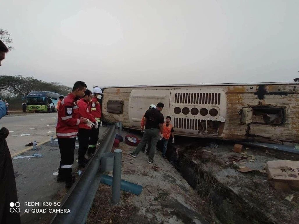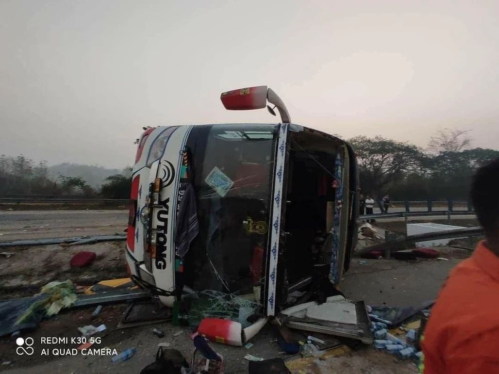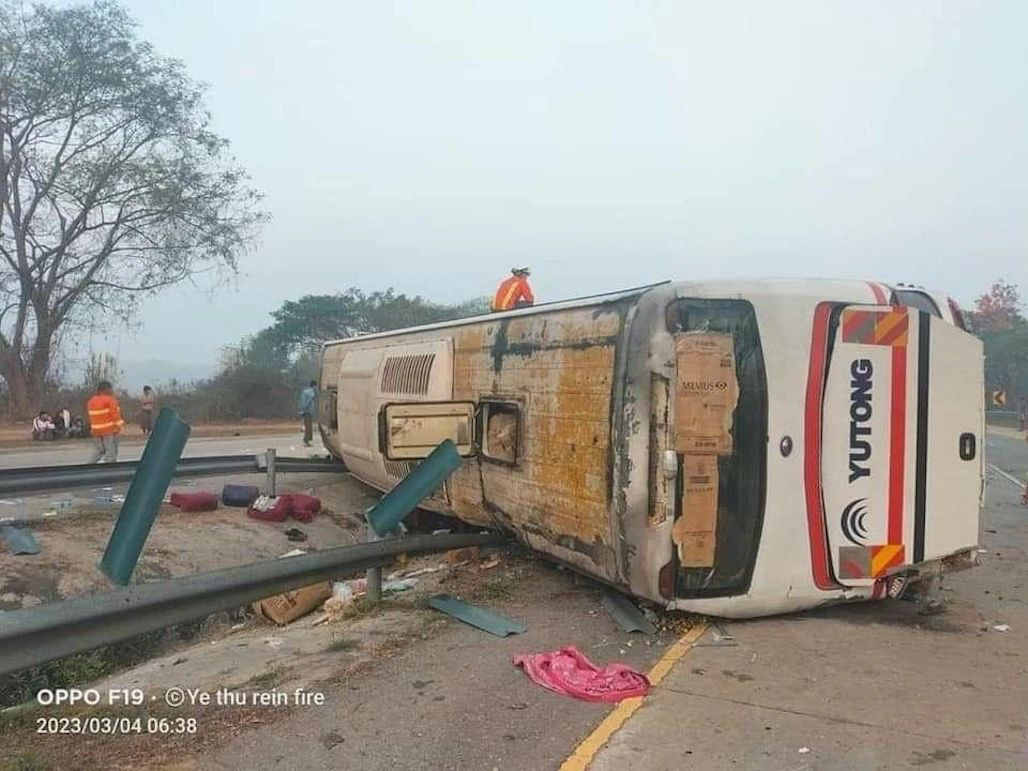 【缅甸金凤凰讯】据悉,今日(3月4日)凌晨约5时30分,一辆从东枝出发的客车在仰曼高速公路167/4和167/5英里之间,因无法控制车速,与路中间的护栏柱相撞而翻车。