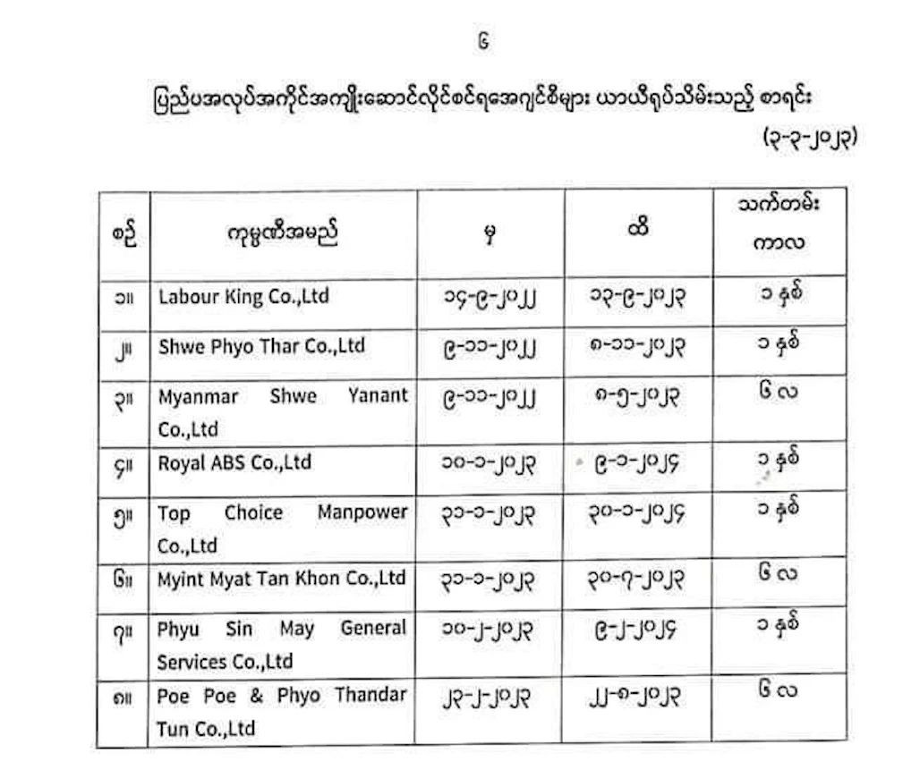 根据劳工部的一份声明,在被暂时吊销牌照的8家机构中,Labour King Co.,Ltd၊Shwe Phyo Thar Co.,Ltd၊ Royal ABS Co.,Ltd၊Top Choice Manpower Co.,Ltd和Phyu Sin May General Services Co.,Ltd暂时被关闭1年。