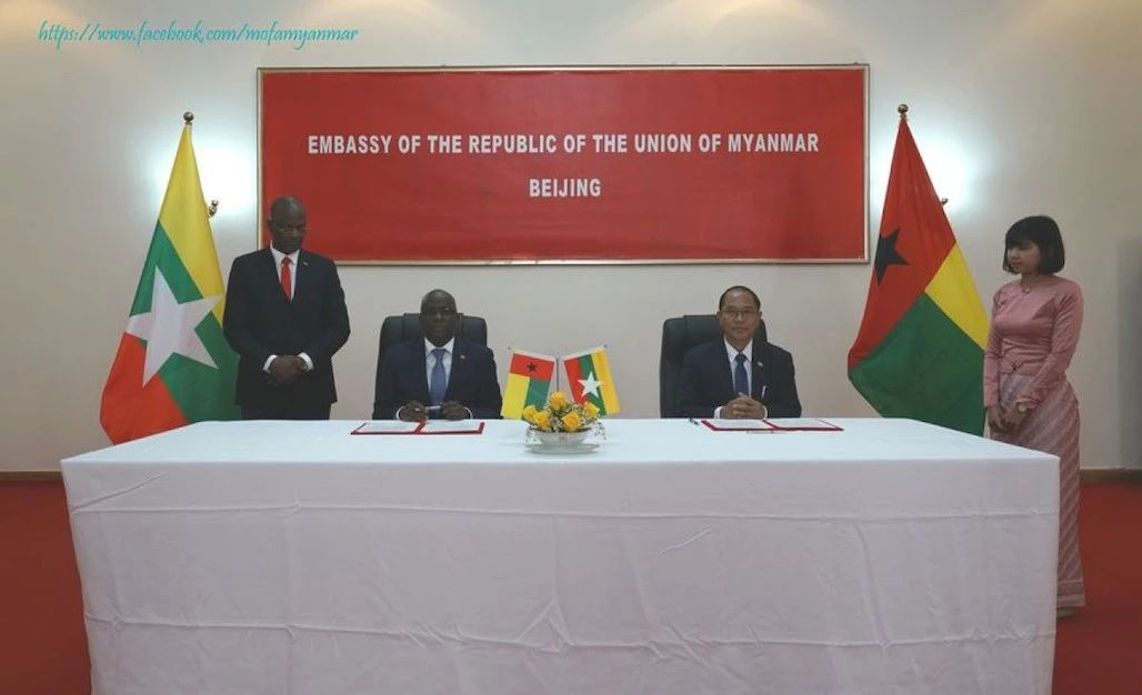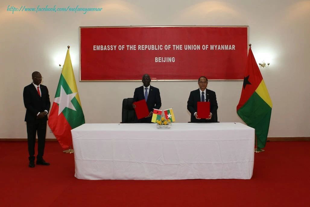 缅甸驻华大使吴丁貌穗(ဦးတင်မောင်ဆွေ)和几内亚比绍驻华大使安东尼奥•塞里福•恩巴洛(António Serifo Embaló)在缅甸驻中国大使馆共同宣布两国正式建交,并举行签字仪式。