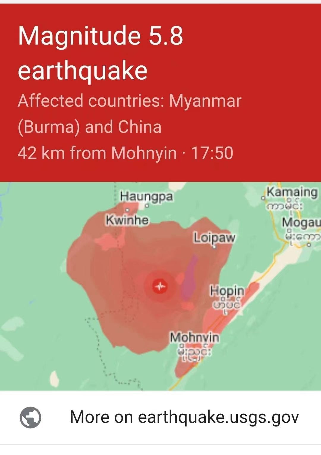 速报!缅甸发生5.8级地震!靠近中缅边境