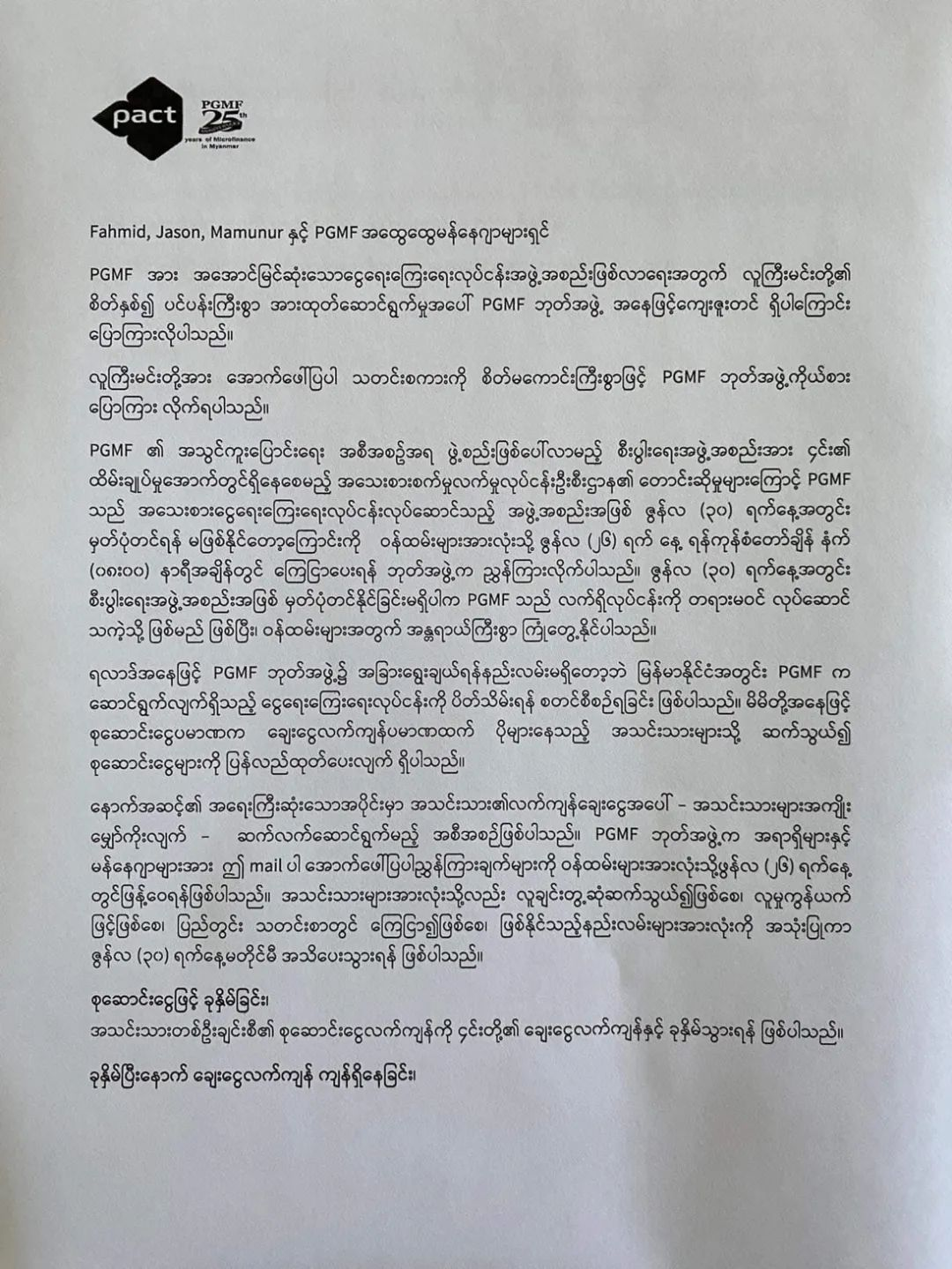 PGMF正式公布称,如果PGMF未能在6月30日之前重新注册为商业组织,那么PGMF将被视为非法开展业务。员工可能面临巨大危险。因此,会员的贷款以储蓄余额抵消,如果储蓄金额大于贷款余额,将会继续发放储蓄资金,反之贷款余额较多,也不用偿还,贷款者不再有义务向Pact Myanmar或任何其他人偿还贷款。所有从PGMF获得的贷款余额将从6月26日起全部清算;即日起不管谁向贷款者索要贷款也不需要偿还,由于Pact Myanmar的退出,4000多名员工将获得应得的遣散费。