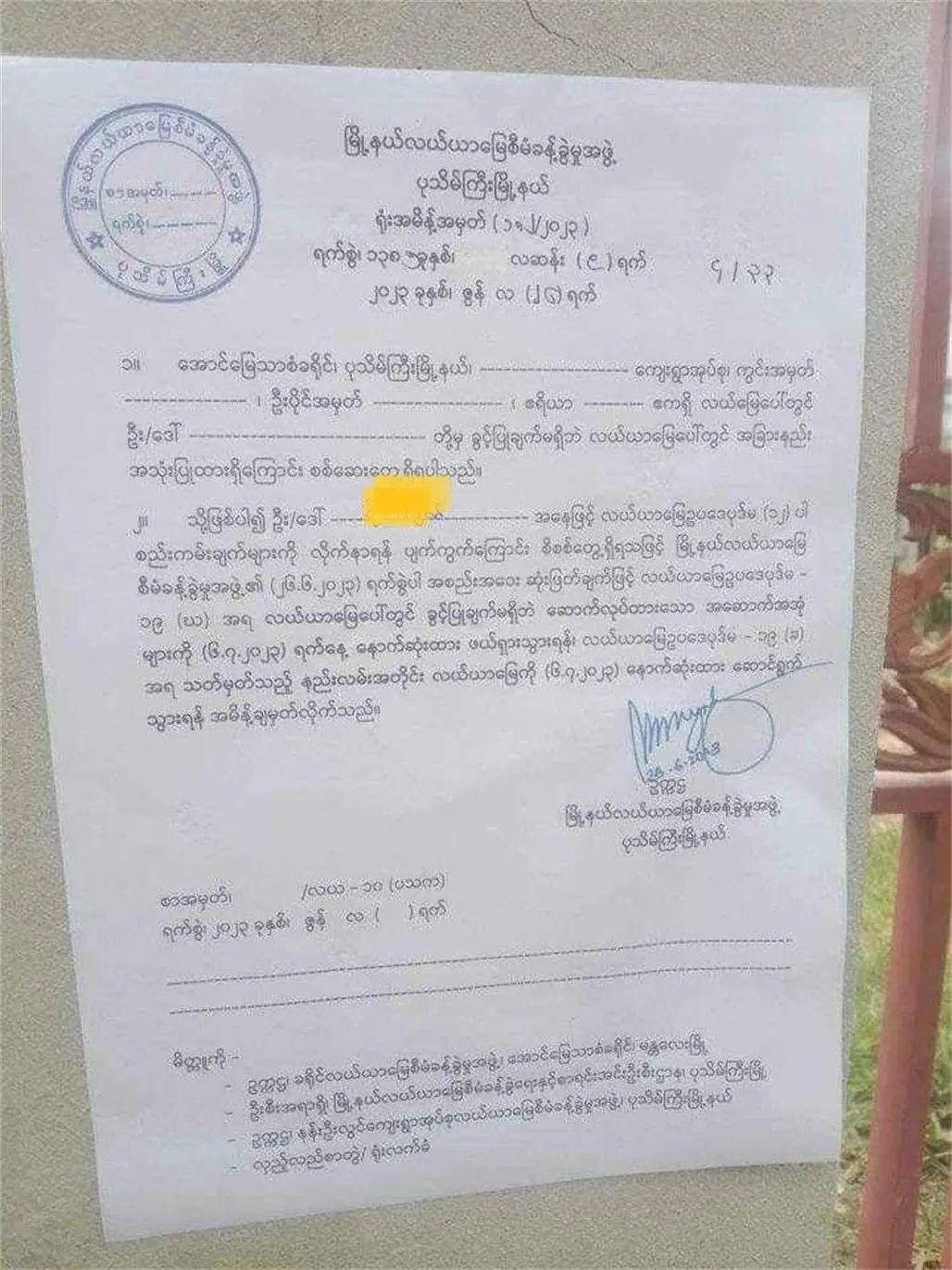 【缅甸金凤凰讯】据悉,曼德勒市巴登吉镇区(Patheingyi,ပုသိမ်ကြီးမြို့နယ်)南乌伦村(Nan Oo Lwin,နန်းဦးလွင်ကျေးရွာ)约一半的房屋已收到镇区农地管理委员会的通知书,要求这些房主在2023年7月6日之前将违规建设的房屋拆除。