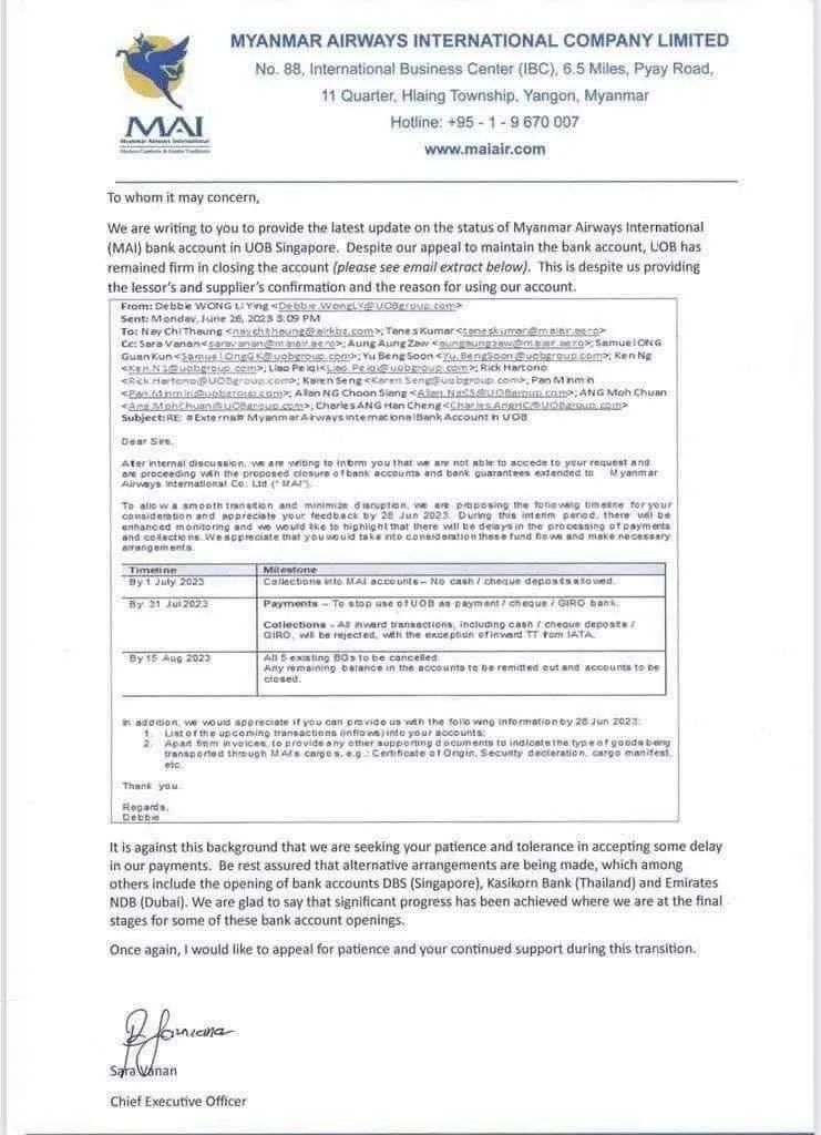 “大华银行方面将于8月15日之前关闭MAI航空的5个银行账户,MAI方面呼吁保持这些账户的开放。”MAI首席执行官Seravanan Ramasamy签署并发送给业务合作伙伴的一封信中包含了上述内容。